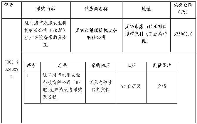 駐馬店市農(nóng)服農(nóng)業(yè)科技有限公司(BB肥)生產(chǎn)線設(shè)備采購(gòu)及安裝成交公告